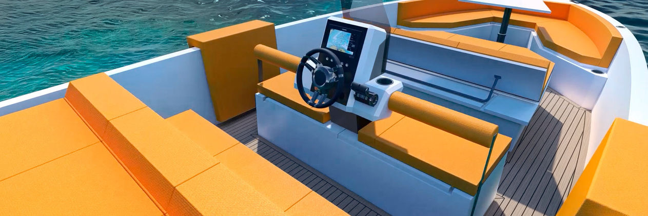 The design of its V shaped hull, allows gliding quickly and developing a top speed up to 38 knots with maximum motorisation, as well as a highly comfortable navigation at cruising speed. Its generous beam and weight distribution make this boat very stable for anchoring and give a great habitability on deck. The layout of the volumes allows a convenient peripheral circulation with the concept “walk around”, with the entire deck at the same level, with different solarium spaces, seats and tables both at bow and stern, with a level of use of space and an incomparable sensation of spaciousness, even at its maximum capacity of up to ten people.